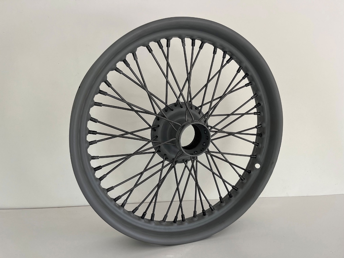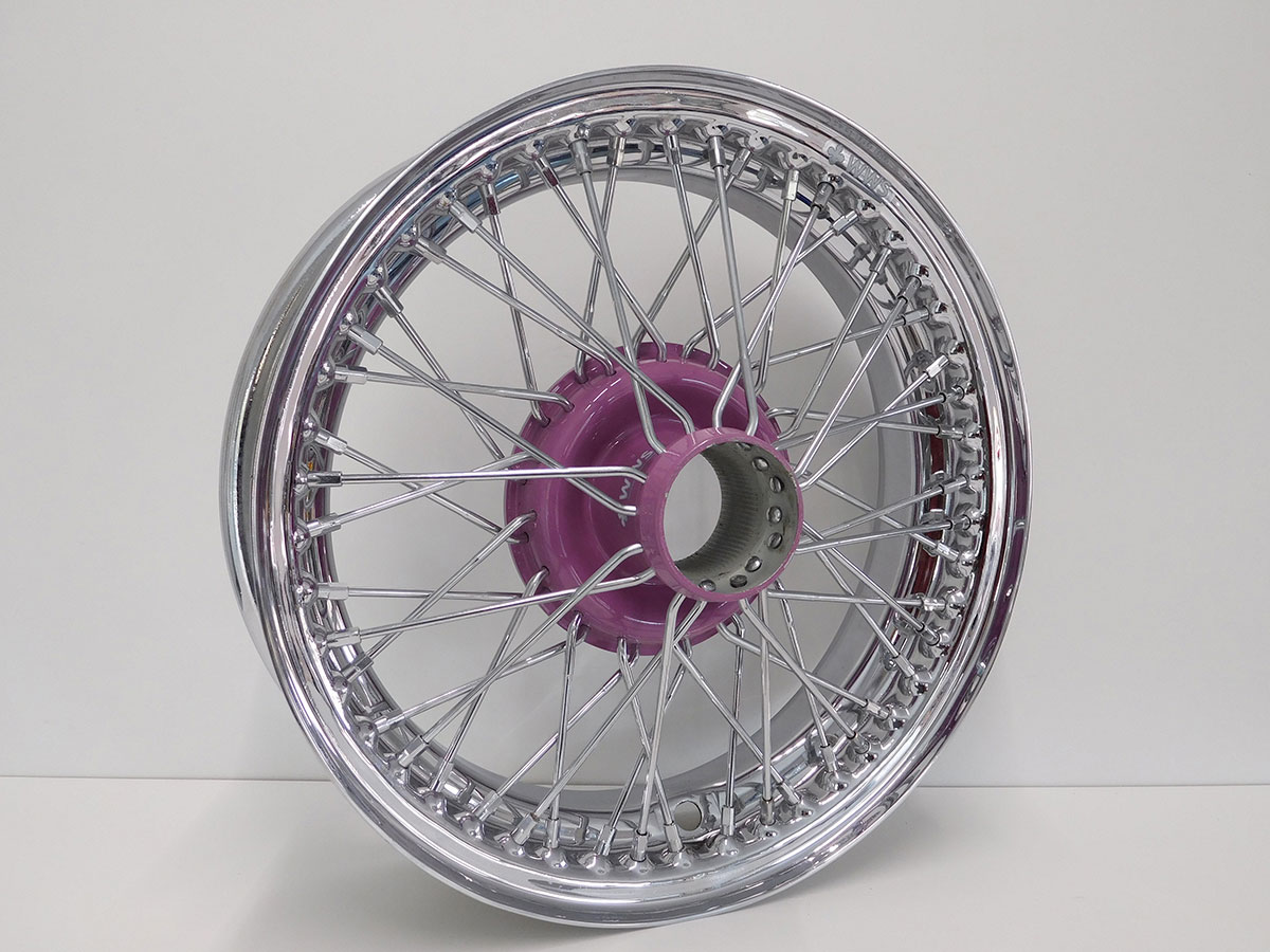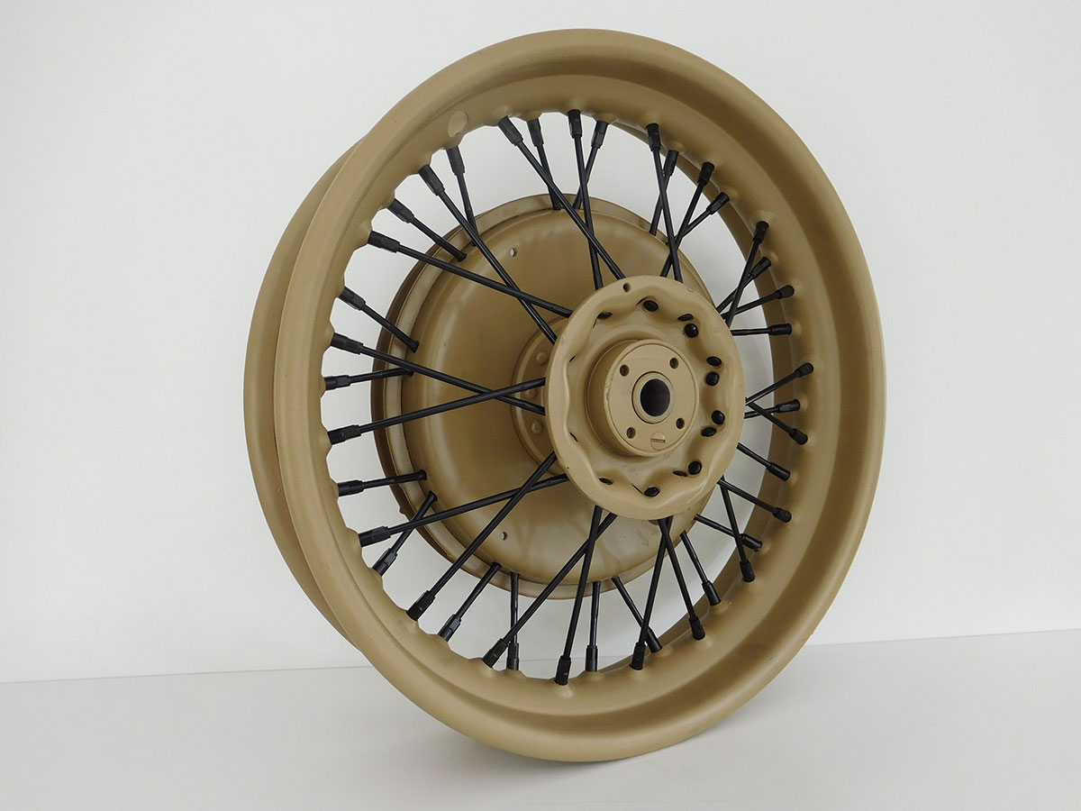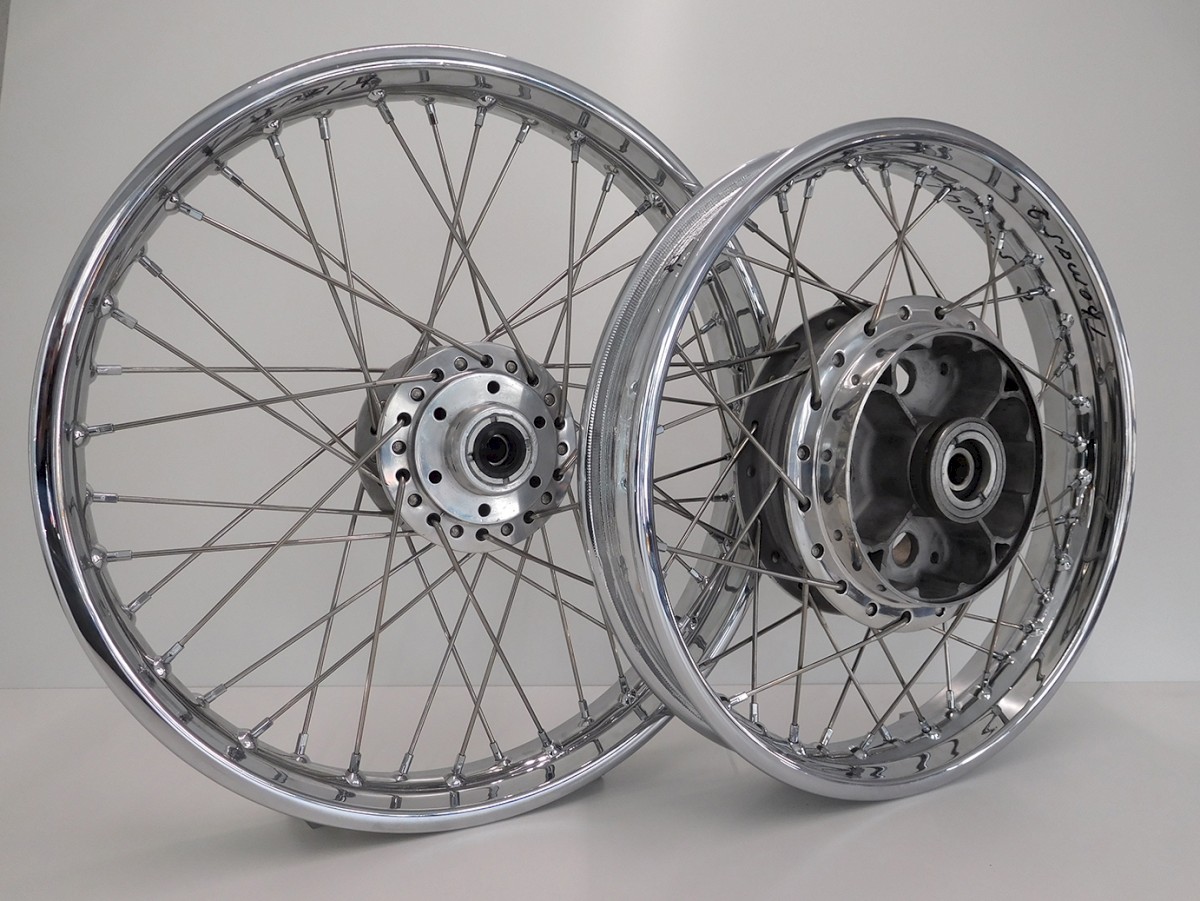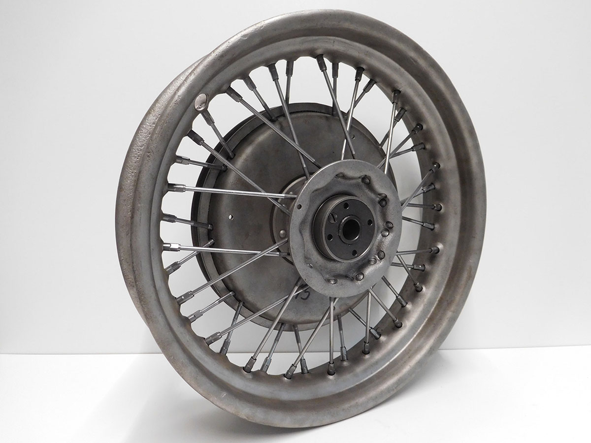 Lacing, by and large, is pure craftsmanship, apart from the assembly of the original. It generally takes place according to the specifications of the original. Special lacings in rebuilds with different rim sizes and widths can change significantly the spoke image. This is how the classic 40-hole Harley wheels are modified with 80-hole wheels, for example. Once the wheel has been spoked, it is tensioned and centred.
