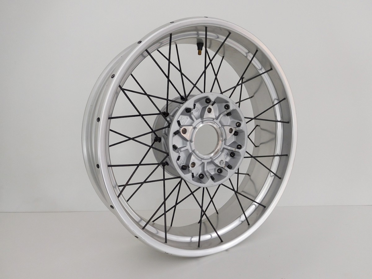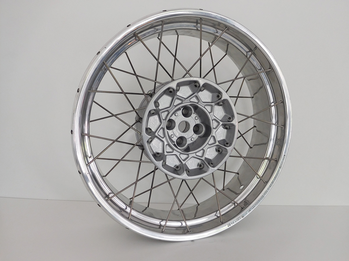 The cross spoke wheels represent a relatively new spoke wheel structure. Since the mid- 1980s, BMW had found a way to use tubeless spoke wheels. Here, the head of a straight pull spoke lies outside in the rim flange. The spoke nipple is installed on the hub side and has a Torx drive; this allows centring of the cross spoke wheel from the hub side – the classical spoke wrench is of no use here. This structure means that no air can escape through the dimpling/bore holes that are otherwise located in the centre. The term cross spoke wheel comes from the appearance of this structure. The spokes cross between the individual levels; this is not the case in a classical spoke wheel structure.
